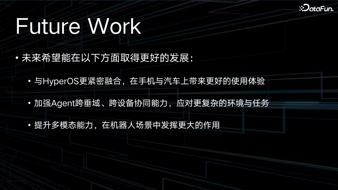 首先是和系统更紧密地融合。在做 Agent 项目的过程中,我们发现 Agent 到底能带给用户多大的惊喜,其实和它能与外界产生多大的交互有着非常紧密的关联。如果 Agent 能做的仅仅是去网站上搜索一些内容,再来总结给用户,其实能带给用户的惊喜是比较小的。所以我们现在正在做的一个工作就是在去梳理小米内部的 SPEC 的定义。包括手机系统的应用,米家设备的调用,以及车载设备接口的情况,我们希望设计一套整体的 SPEC 的定义,方便大模型去感知到小米整个体系下所有它可以操纵的设备和可以感知到的信息,从而为用户带来更好的使用体验。