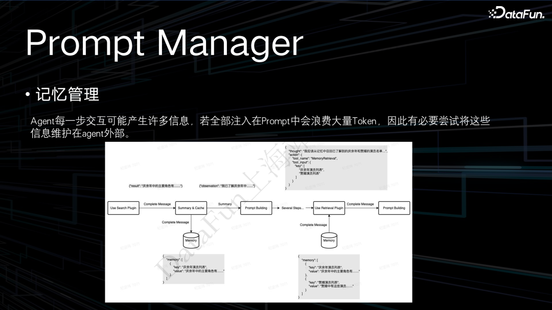 再来介绍一下前面提到的记忆管理的问题。例如 query 是想知道《庆余年》和《赘婿》两个电视剧中重复的演员都有谁。在这个场景中,会先去查询《庆余年》中的演员列表,再去查询《赘婿》的演员列表,然后做一个对比。我们之前的发现是,它在查询了《庆余年》的演员列表之后,如果把它持续地装在 prompt 中,是非常消耗 token 的,还会导致重复生成或者一些不稳定情况的出现。所以我们进行了改进,现在查询之后,会有一个总结的动作,之后把总结的内容当作上轮的查询结果注入到 prompt 中,然后告诉它上轮已经知道了这些信息,这些信息以一个约定的 key 存储在记忆库中。我们又设立了一个新的 plugin,名为 retrieval。这个 retrieval plugin 的描述就是已知在记忆库中有哪些信息是以前知道的,可以调用这个 retrieval plugin 从记忆库中召回你想知道的信息。