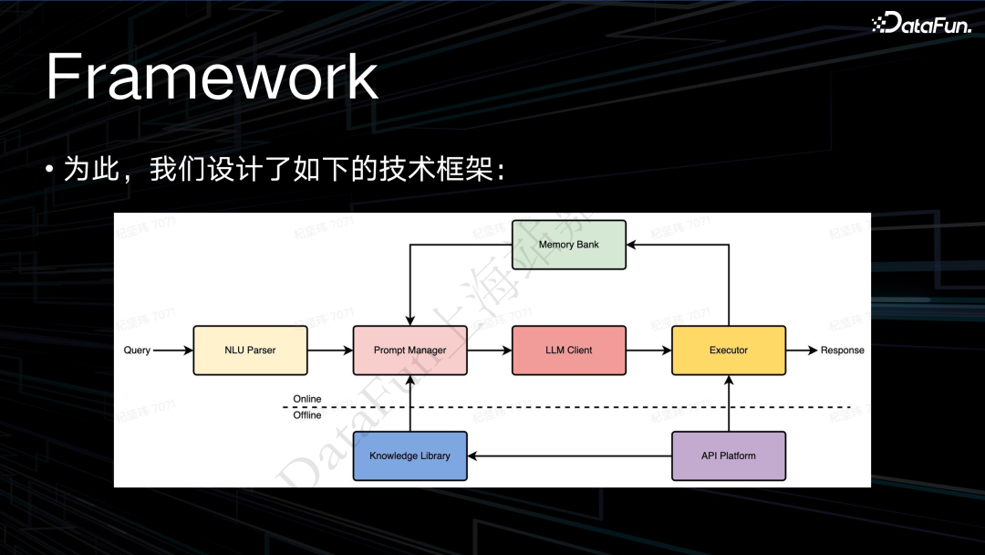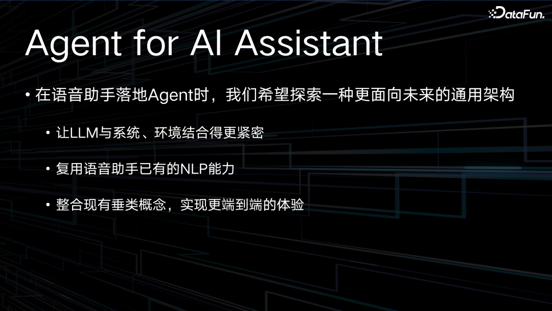 小爱是一款已经面世多年的产品,有非常多的历史积累,有自己的一套架构。我们肯定不希望把现有的这一套架构推翻,让用户的查询进来以后直接接入大模型的框架,而是希望能复用语音助手现有的一些 NLP 的能力,让大模型在其中去解决一些原有的传统 NLP 无法解决的问题,这样才能带给用户更好的体验。