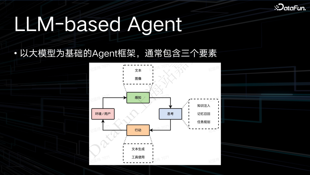 Agent 主要包括三个环节,即感知、思考和行动,所有 Agent 范式都大致一样。对于小米语音助手而言,环境变量主要来自于手机系统、家庭设备以及小米汽车的一些车载信息。来自用户的信息主要是小爱每天接收到的来自用户的各种查询请求。