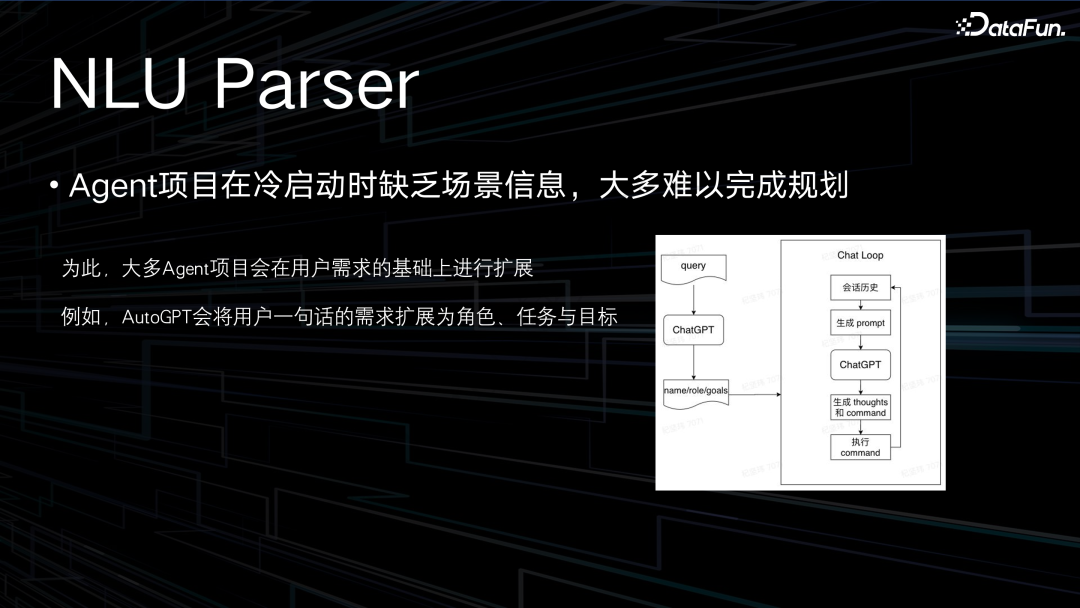 传统的语音助手下面都会分不同的垂域,如天气、信息工具等等。以前要展开一些跨垂域理解,都是比较难的一些任务,用户如果直接问今天上海的天气是什么,这个其实大多数的语音助手都很好解决。但如果用户问的今天上海的天气适合穿什么样的衣服,可能就需要更多的策略的融入,需要去先查询到天气,然后根据天气的状态,再结合一些常识的背景信息,去做更复杂的计算。这种跨垂域的应用,在传统 NLP 中不太容易去解决,这也是我们希望引入 Agent 去处理的一些问题。