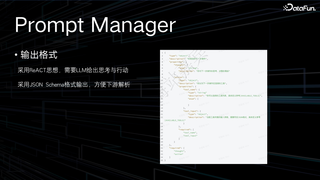对于输出,我们希望对结果可以轻松地进行解析。输出格式也是采用 Json 格式。并且参考了现在业界常用的 react 的思想,让每一轮输出时都去输出它当前的思考以及它选择的工具和参数。基于输出结果,下游的执行器在拿到这个结果之后,可以直接调用已经注册的 plugin,操作对应的动作。
