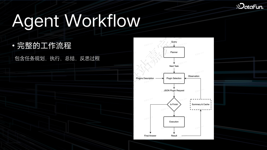 上图中展示了 Agent Workflow 完整的工作流程。当收到一个 query 以后,(此处省略了 NLU Parser 这一步)首先会由一个 planner 去输出待执行的任务,这些待执行的任务会依次经过工具的选择,判断它现在是否是 finish 的状态,如果是 finish 就会直接返回最终的结果,如果不是就会去执行器做一些真实的与接口之间的交互,得到交互结果后进行总结和缓存,再把这个结果信息返回给规划的流程。依此往复,帮助用户解决一个实际的需求。