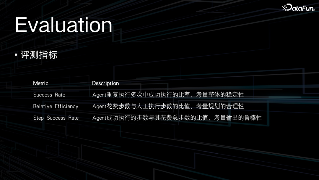第二个是相对效率。在设计一个任务时,产品经理会预想 Agent 需要分哪几步来完成一个动作,但是 Agent 可能并不会按照我们设想的这样来一步一步地完成,其中可能会有一些冗余,因此我们会去衡量 Agent 完成一个任务时花费的步数和人工执行所需步数的比值。