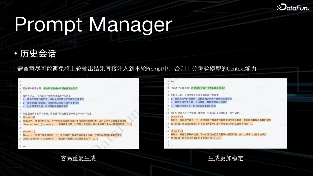 因此我们对历史注入进行了改造,会把它刚才得到的这一段结果做一个总结,把总结的内容当作上一轮已经了解到的情况。还有一个 memory bank 的操作,总之就是不让它在上文中直接看到之前那一轮输出的结果。这样生成就会更加的稳定,而不是倾向于直接从输入的信息中去 copy 一段内容出来。