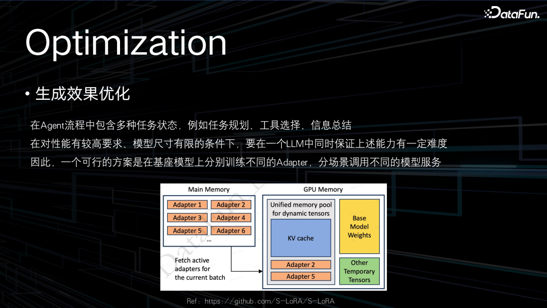 为了提高速度,我们当时的一个朴素的想法就是能否用更小的模型来完成这件事情。我们尝试了百亿级的模型,发现要在模型尺寸有限的条件下去完成任务规划、工具选择、信息总结这些事情,会有一种此消彼长的情况,在做指令微调时也不那么容易平衡各个数据的比例。因此我们又尝试利用 Lora Adapter 的方法,去训练多个子模型,让每一个专家模型来完成固定的一个任务。这样性能上得到了提升,同时也保证了整体流程的稳定性。