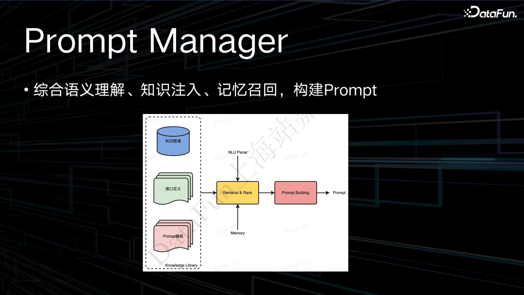 在整个系统中最主要的模块是 Prompt Manager,其主要作用是从我们已经建设的知识图谱、定义好的接口或者 plugin,以及预先定义好的一些 prompt 的模板中,去做一个召回和排序。通过 NLU Parser 得到结果,从中选择有用的信息来构建 prompt。在此过程中比较复杂的就是 retrieval 的工作。