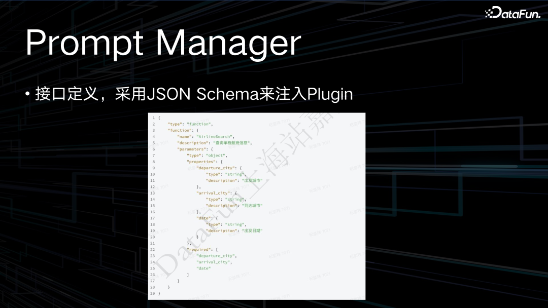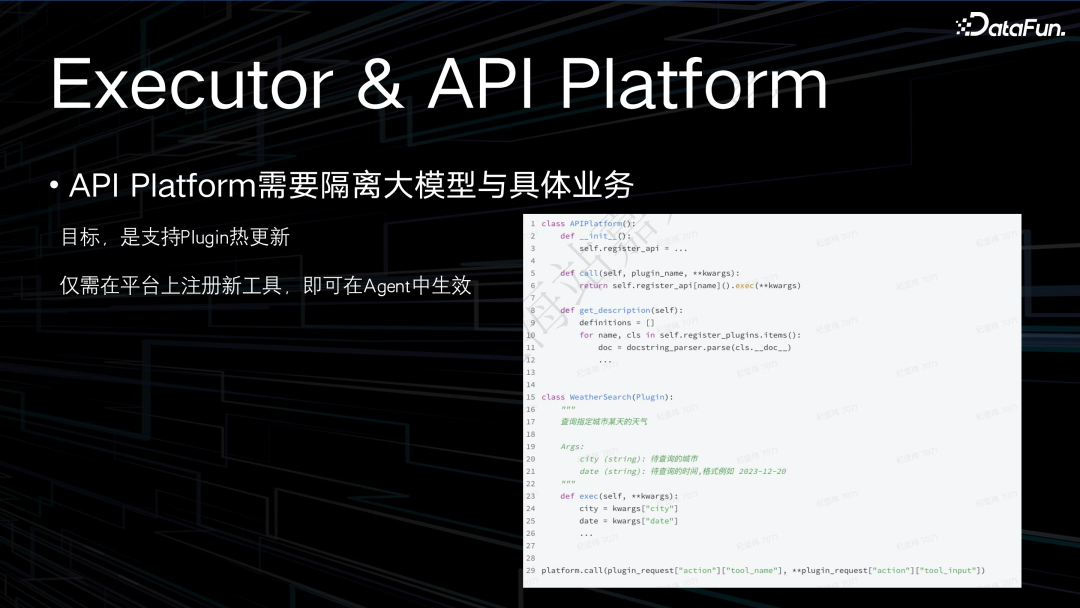 API Platform,有些系统中定义为 Plugin Library。定义时有两个主要的方法,一个是根据 plugin 的名字和一个参数列表,直接来调用已注册的 plugin;另外一个就是通过 get_description 的方法去获取已定义 plugin 的一些注释,这些注释可能会用于直接生成注入给 prompt 里面的 plugin 的描述。注册也非常简单,会通过预定义的接口来实例化一些 plugin。后续要添加其它这样的工具,就直接继承我们设计好的一个基类,按照定义的接口去实现其中的方法。Plugin 定义和 Agent 整个流程是相互隔离的,只要注册了一个新的方法,大模型就可以直接感知到,这是我们设计 API Platform 的核心思想。