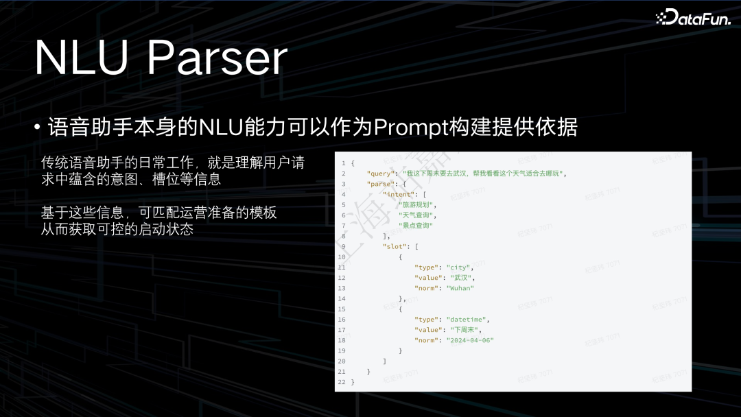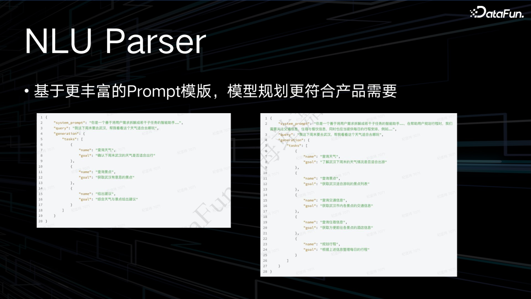在语音助手里面,在之前的传统 NLU 理解里面,这些 prompt 信息是比较容易获取的。因为传统语音助手本来在做的就是意图分类和槽位抽取,所以传统的语音助手可能不擅长于规划任务,但比较擅长去找到一个 query 中的主题信息,所以我们可以快速地用一些轻量级的模型去找到用户 query 可能包含的意图,以及里面包含的槽位。
