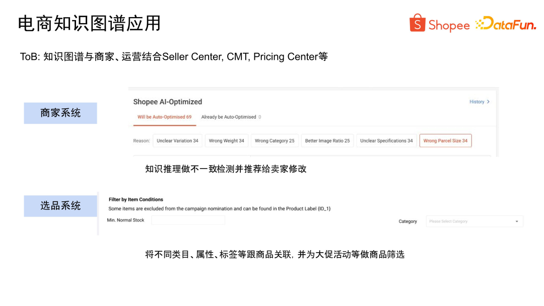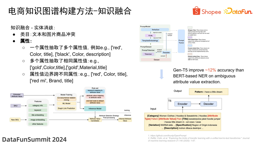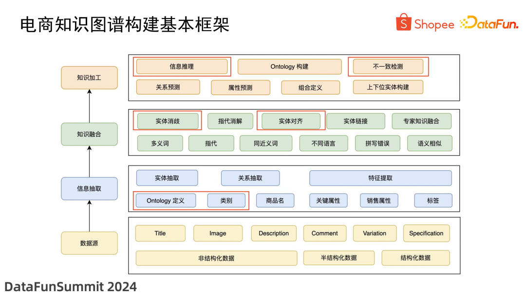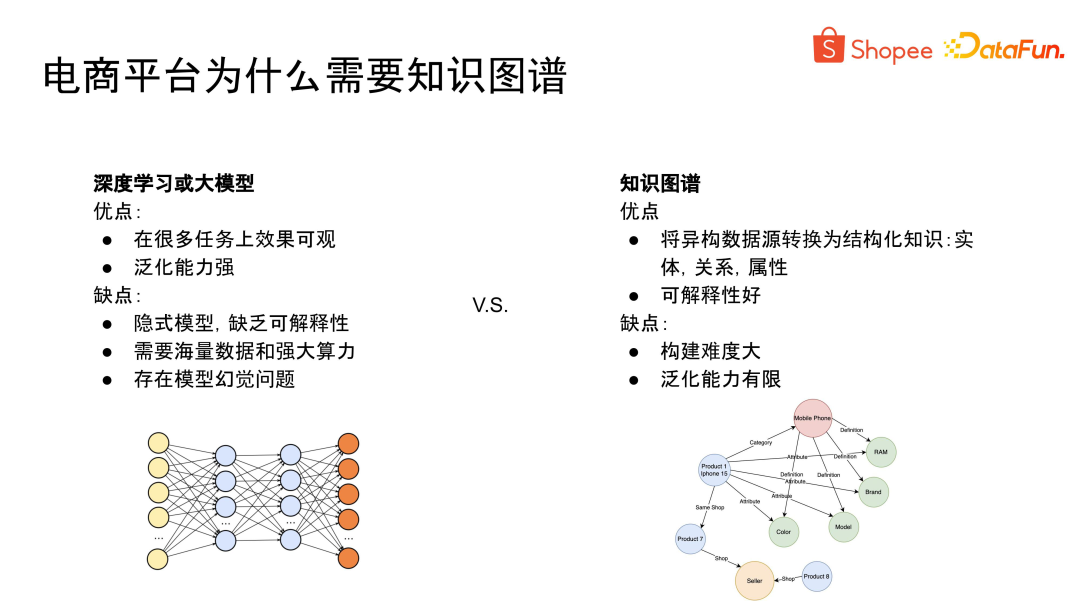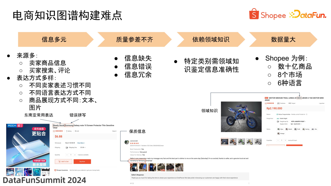 - 最后是数据量大。以 Shopee 为例,我们拥有数十亿种商品,涵盖了 8 个市场,使用了 6 种语言。如何将如此庞大的信息融合构建成一个统一的知识图谱,是一个巨大的挑战。