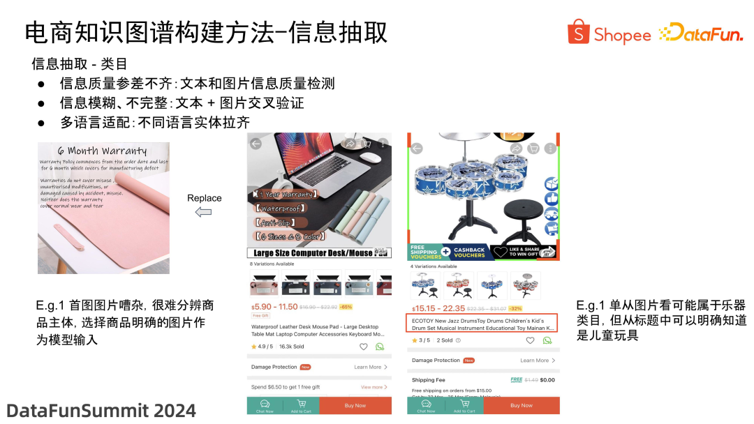 其次,信息还可能模糊或不完整。例如,右边的例子中,单看图片可能会认为是一个乐器架子鼓,但实际上在标题中会发现它是儿童乐器玩具,应属于儿童玩具类目,而不是乐器类目,这是一个较大的差异。