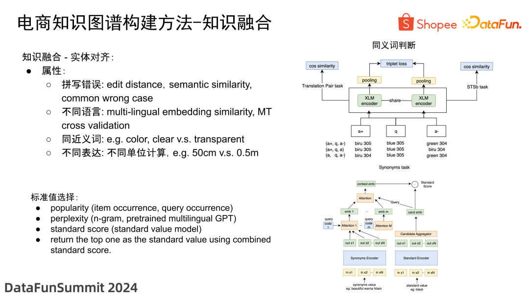 知识融合的另一个难题是实体对齐。以属性为例,在实体对齐中涉及多种类型。我们的目标是对齐同一属性值的不同表达方式。对于拼写错误的问题,可以通过编辑距离、语义相似度、常见错误集合等方法处理。对于不同语言的问题,可以使用多语言嵌入相似度和模型翻译等方法解决。同义词和近义词的区分可能会有一些困难,因此我们借鉴了 Labse 模型框架,训练了一个同义词模型。重点区分词形相似但语义差别很大,以及不同词形但语义相近的情况。还有不同单位的情况。例如,一个人可能用"50cm",另一个人用"0.5m",我们针对这种情况进行了单位转换计算等处理。