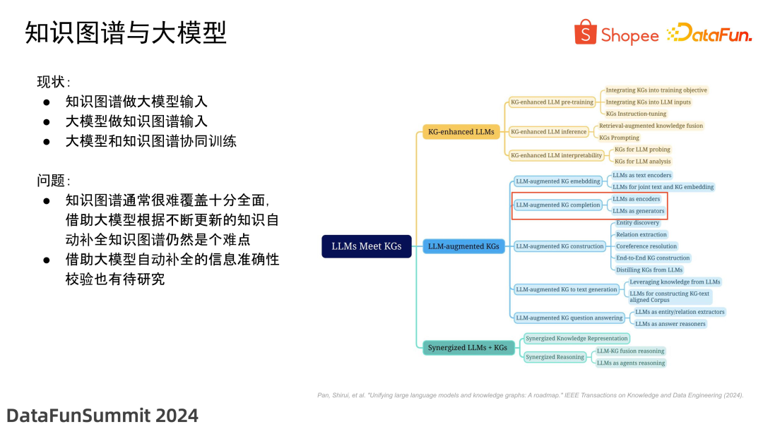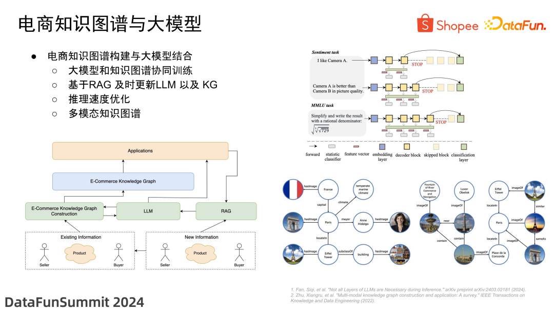 让我们进一步聚焦于电商领域中知识图谱与大型模型的结合方式。之前提到的三种结合方式在这里都是适用的。除此之外,在电商领域,信息的更新速度非常快,每天我们都会有数十万甚至上百万个新商品的注入和更新。在这种情况下,如何利用现有技术,例如 RAG,来帮助大型模型和知识图谱实现及时更新,同时及时响应实际应用场景,这也是值得研究的一个重点方向。