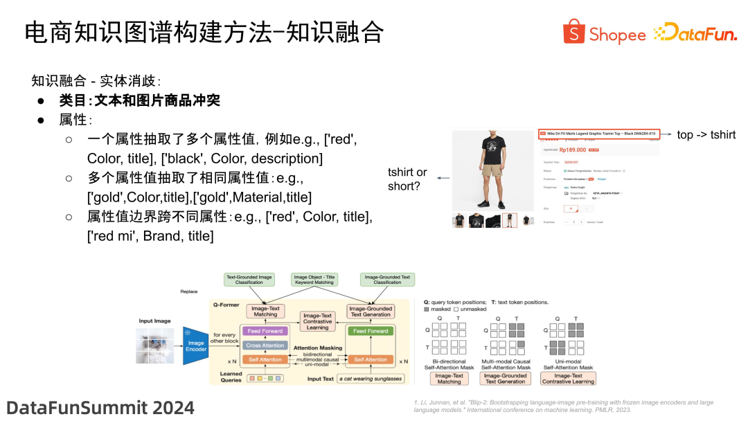 首先,对于类目而言,输入是文本和对应的图片,消歧问题体现在文本和图片信息之间的一些冲突。以上图右边的例子为例,商品图片质量是相对较高的,然而仅凭图片难以确定是在卖上衣、短裤还是整套服装,通过标题我们可以明确推断出是在售卖上衣。因此,我们结合文本和图像对齐的任务,训练了一些模型,其中一个典型的框架 Blip。我们借助这个框架,做了一些改进。