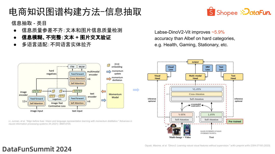 针对信息模糊或不完整的情况,我们采取的方案是根据文本和图片进行交叉验证。提到文本和图片的交叉验证,大家可能会首先想到多模态模型,我们也进行了许多相关尝试。我们微调了 ALBEF 模型,通过图像和文本的对比学习结构,直接预测对应的品类。