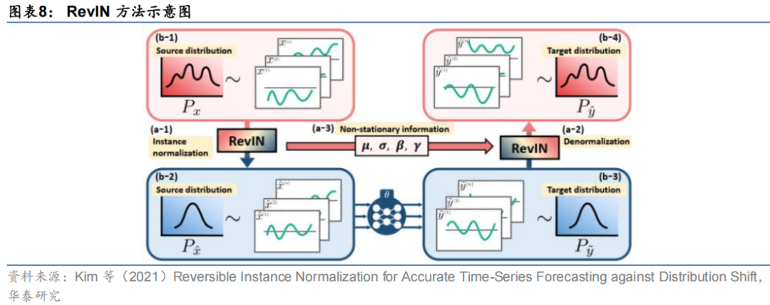 Kim等(2021)提出了一种可逆时序标准化方法RevIN(Reversible Instance Normalization),对输入时间序列进行可学习的标准化变换,将非平稳时间序列转化为符合标准分布的时序特征进行训练,对模型预测目标时序分布再进行逆标准化还原原始数据中的时变信息。