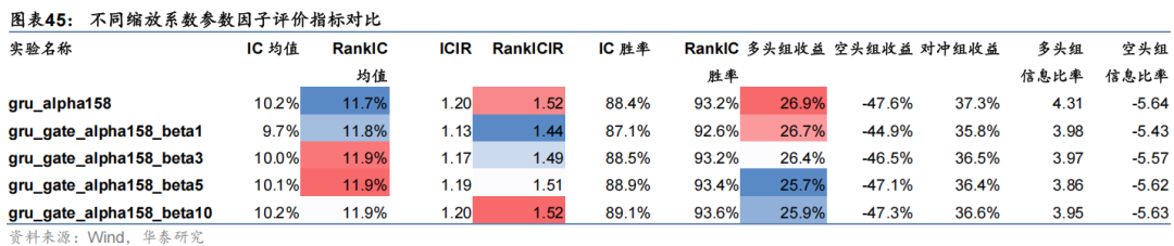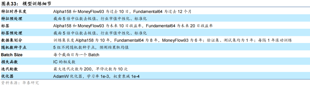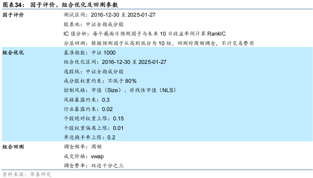 实验最后一步对模型输出预测值进行定量评价,并进一步基于该预测值构建指数增强组合和回测,以上步骤中涉及参数汇总如下。