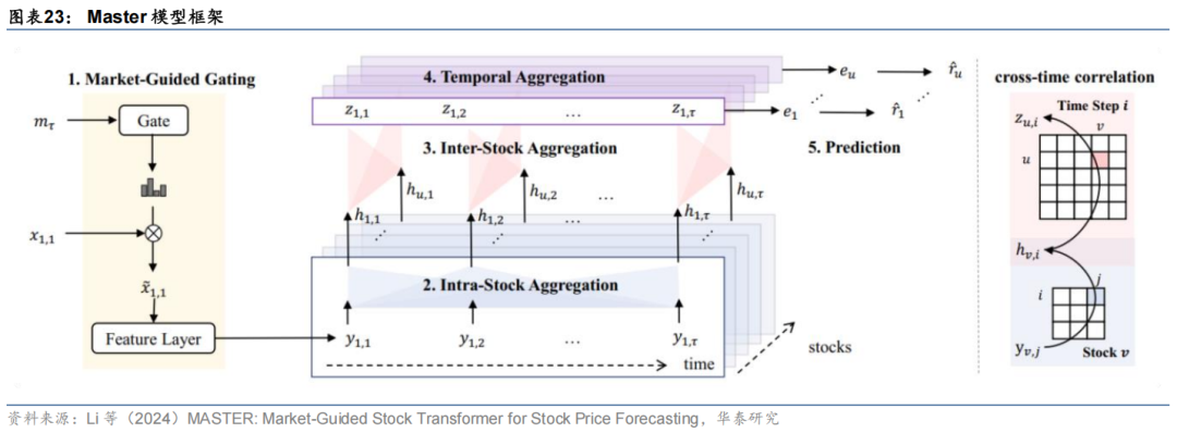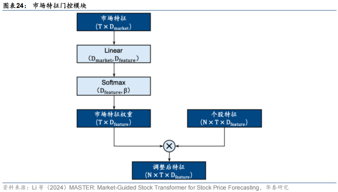 以上汇总文献主要针对时序预测任务中的数据漂移问题提出了相对通用性的解决方案,除此之外也不乏直接围绕量化选股中股票收益预测任务中数据分布漂移问题所做的研究。近期前沿研究中较有代表性的是由上海交通大学以及阿里的Li等人于2024年发表于AAAI的会议论文,该研究针对股票市场中数据漂移的问题,提出了Master(MArket-guided Stock TransformER)模型,主要做出了两方面的创新:1、市场特征门控模块:将市场状态以宽基指数对应指标的形式显式表达,并通过门控模块输入神经网络,对个股特征进行动态加权;2、多维注意力特征提取模块:模型主体由两层标准自注意力层以及一层简化注意力层堆叠而成,前两层分别提取每只股票时序变化的信息、单个截面各个股票间的信息,最后一层对时序信息进行聚合得到当前时间步的输出。Master模型针对数据分布漂移的解决方案可归类为模型结构的优化。与Chen等(2024)研究思路类似,将市场特征视作模型预测时的上下文信息,在不同的上下文背景(市场环境)下对模型进行微调(调整输入特征权重)。模型整体框架如下。