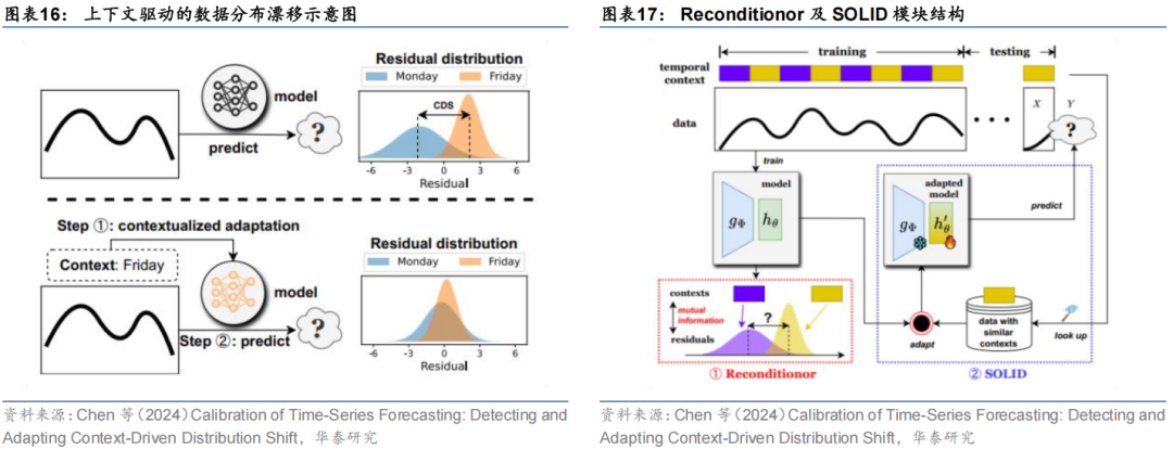 Chen等(2024)提出了一个数据漂移检测和自适应框架,主要包括了Reconditionor(Residual-based context-driven distribution shift detector)和SOLID(Sample-level cOntextuaLIzed aDapter)两个模块,其中Reconditionor模块用于评估预测残差与数据分布之间的互信息,以衡量模型对分布漂移的敏感度,当探测到严重偏移时,SOLID模块则会利用有限步数对模型的预测层进行微调,从而实现最优的偏差方差平衡。