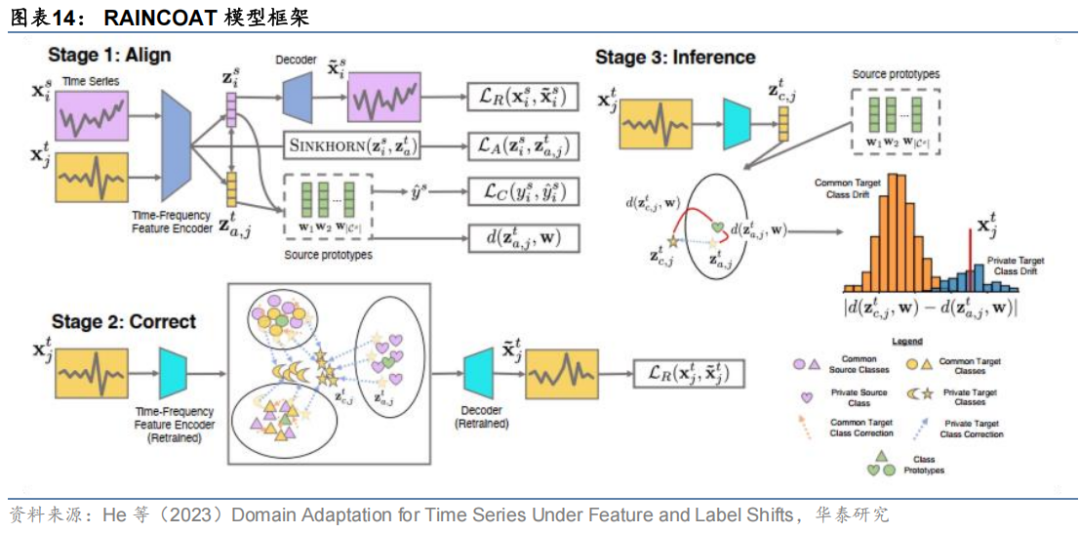 哈佛大学的He等(2023)提出了RAINCOAT(fRequency augmented AlIgN-then-Correct for dOmain Adaptation for Time series)模型,对训练域和预测域时间序列数据分布的时域和频域特征进行建模,通过对齐、修正和推理三个阶段实现域自适应。