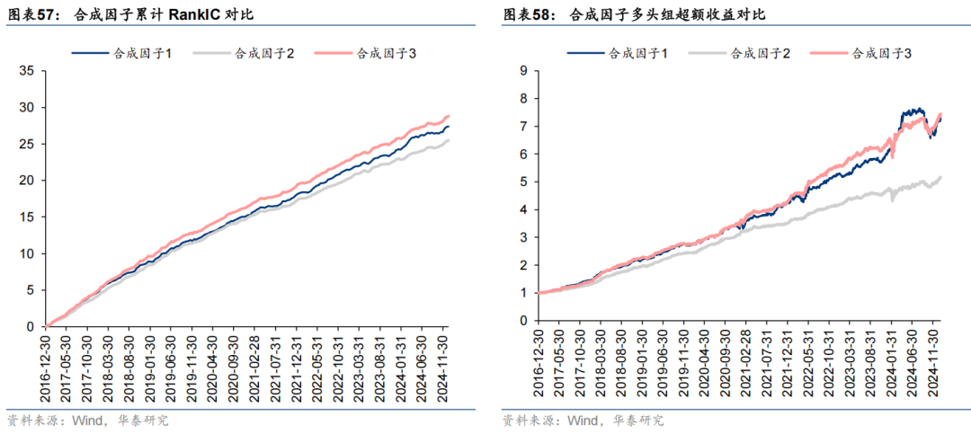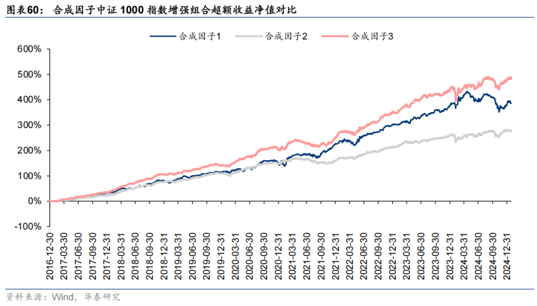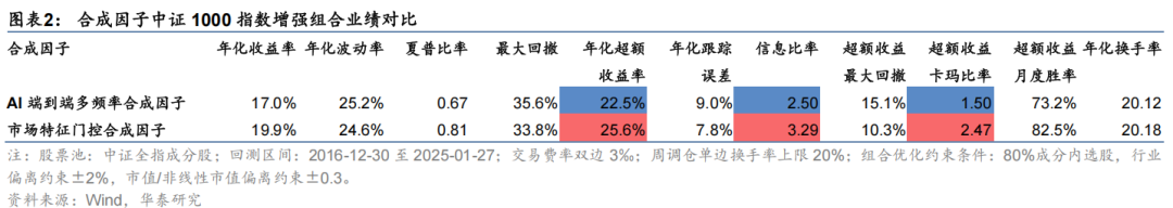 本节基于前文构建因子,结合AI端到端因子挖掘模型输出因子合成得到综合因子,并基于该因子构建中证1000指数增强组合。本节拟构建三个合成因子,具体构建方法如下。其中合成因子1和2作为基线参考,分别对应传统端到端AI量价多频率合成因子,以及三组特征集GRU合成因子的表现,合成因子3在端到端AI量价因子的基础上,引入市场特征门控和三层注意力特征提取模型的预测因子。以上每组因子合成时权重均为等权。