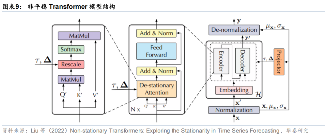Liu等(2022)在Transformer模块的基础上改进得到了非平稳Transformer。该模型框架同样采用可逆平稳化的方式处理输入输出时间序列,但在模型结构中将Transformer中的注意力机制改进为去平稳化的注意力机制(De-stationary Attention),将非平稳时间序列信息注入神经网络中。