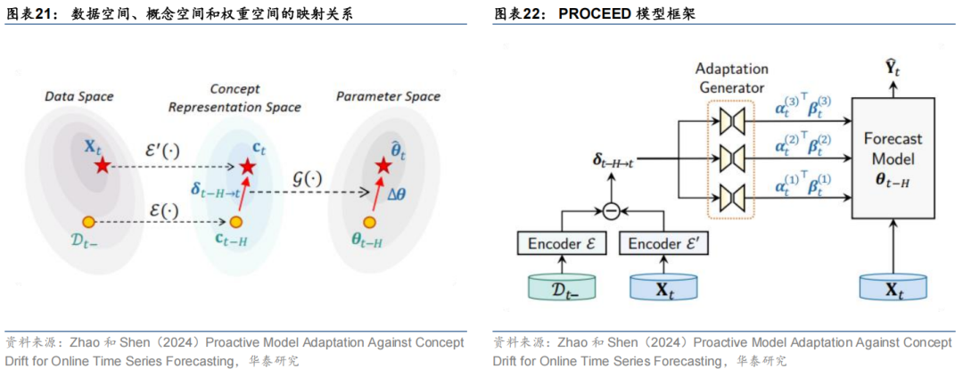 Zhao和Shen(2024)提出了一种具有主动适应能力的在线学习框架PROCEED,该框架通过一组编码器捕捉近期训练数据与测试数据间的概念漂移,并将其映射至模型权重之上,从而在模型在线推理时引入数据漂移信息,达到主动自适应调节的效果。