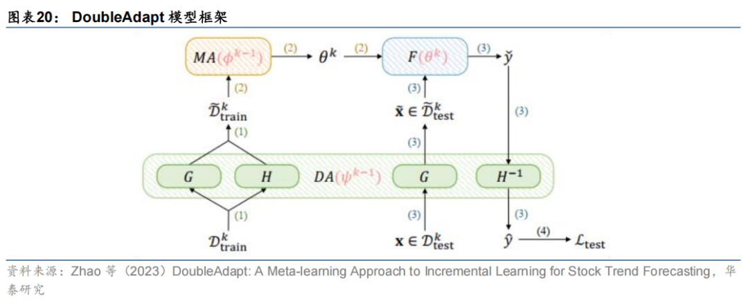 Zhao等(2023)提出了一个元学习框架DoubleAdapt,包含两个基学习器:数据适应模块和模型适应模块。其中数据适应模块的作用类似第一种改进视角,即对数据分布进行动态调整,模型适应模块基于调整后数据优化模型预测准确性;而元学习器的目标即通过多个训练任务优化该两个基学习器的超参数,提升模型在线推理时对新数据分布的适应能力。