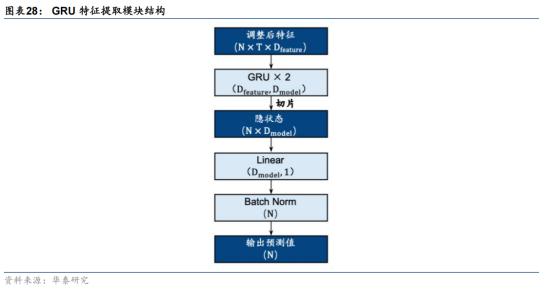 模型主干的特征提取模块同样测试两种方案,方案一与原文献保持一致,即采用三个注意力层提取和聚合;方案二将注意力层替换为华泰金工前期报告中常用且证实有效的GRU模块作为对比,其模型结构如下。