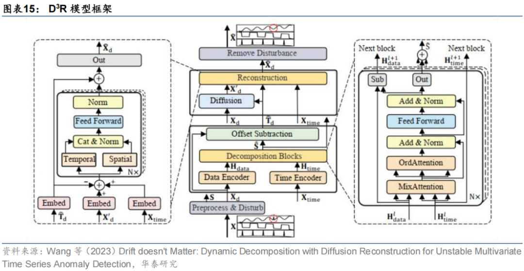 Wang等(2023)针对多变量时序异常检测场景下的数据漂移问题,提出了D³R(Dynamic Decomposition with Diffusion Reconstruction)模型,包含动态分解和扩散重构两个模块。其中动态分解模块针对时序数据漂移现象构建了时序数据-时间戳混合注意力机制,并在训练过程中加入漂移项噪声以增强模型的鲁棒性。