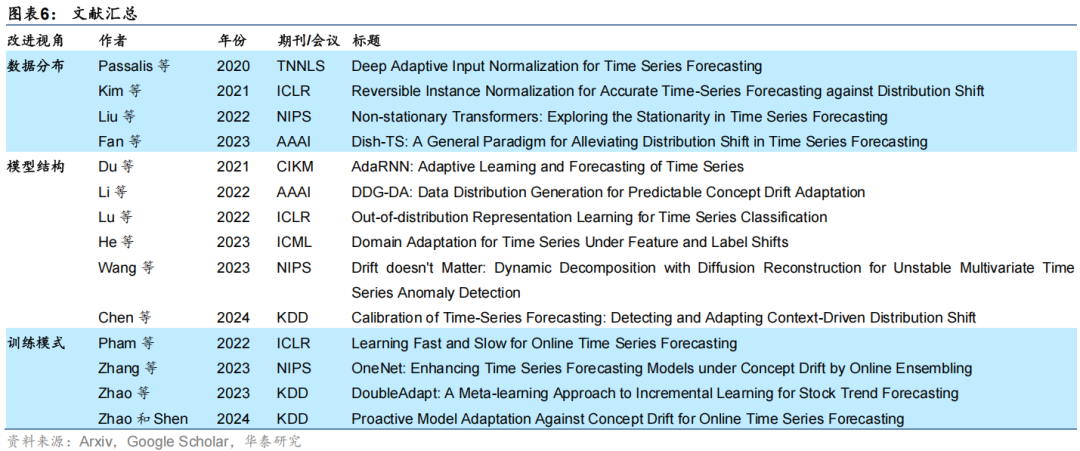 人工智能86:与时偕行:AI模型如何应对数据漂移?金融数据分布在时序上的非平稳性对AI量化模型是关键性挑战,有效应对数据漂移或可提升AI模型的表现。本研究由两部分构成,第一部分针对时序预测问题中数据漂移的应对方法进行调研和综述;第二部分基于AI量化模型应对市场变化的代表性研究进行多方面改进和实证。结果表明,针对特征提取模块结构、门控机制等改进均有效。将传统AI量价因子与市场特征门控因子合成,基于其构建的中证1000指数增强组合2016-12-30至2025-01-27年化超额收益25.6%,信息比率3.24,业绩表现提升显著。应对数据漂移的三个视角:数据分布、模型结构、训练模式本研究针对AI时序预测模型应对数据漂移的方法进行调研和综述。近年来发表于AI顶级会议及期刊的14篇相关研究主要通过三类方法应对数据漂移:其一,通过在模型训练前或训练过程中对非平稳的时间序列数据进行动态调整,化波动为稳定;其二,改进神经网络结构以动态检测和适应数据分布漂移;其三,利用在线学习、元学习、动态模型集成等方式提升模型迭代速度。量化领域相关研究中,Li等(2024)的研究从模型结构出发,做出了两项改进:其一,将市场特征通过门控机制输入神经网络,其二,通过三层注意力机制交叉提取股票时序和截面上的信息,具有较高参考价值。实验结果:市场特征门控机制、特征提取模型结构等改进均有效本研究对市场特征门控模块、注意力特征提取模块在不同特征集上进行多项对比实验。针对市场特征门控模块的实验结果表明,加入市场特征门控模块后因子评价指标及组合业绩均有提升,注意力机制门控表现更优,相比无门控模型中证1000指增组合2016-12-30至2025-01-27区间年化超额收益最高可提升4 pct;针对特征提取模块的实验结果表明,三层注意力特征提取模块相比传统GRU更具优势,三组特征集上预测因子RankIC均值平均可提升0.8 pct。因子相关性测试结果表明,加入门控、修改特征提取模块后因子与改进前因子及传统端到端AI量价因子间相关性均较低。本研究最后基于改进因子尝试进行因子合成并构建指数增强组合。最终综合因子由9个因子等权合成,分别为3个不同频率的端到端AI量价因子以及6个基于注意力门控和不同特征集训练得到的市场特征门控因子。测试结果表明,合成得到综合因子RankIC均值达到14.5%,RankICIR达到1.43,提升显著;基于该综合因子构建中证1000指数增强组合自2016-12-30至2025-01-27年化超额收益25.6%,信息比率3.29,业绩表现优异。01 导读