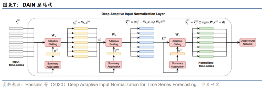 第一类应对方法从数据视角出发,对非平稳的时间序列数据进行调整。Passalis等(2020)构造了一种深度自适应标准化层DAIN(Deep Adaptive Input Normalization),将数据标准化步骤融入到神经网络模型中,构造了一种端到端的自适应标准化模型,在训练的过程中学习时序数据的偏移(shifting)、缩放(scaling)和门控(gating)等标准化规律,并在推理时对输入特征进行自适应的标准化。