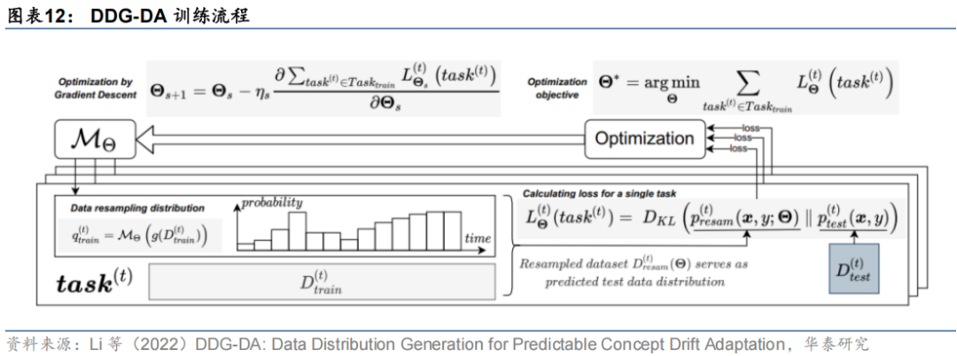 微软亚研院的Li等(2022)提出了DDG-DA模型,该模型认为导致数据分布漂移的某些因素是可预测的,因此其设计了一个预测器用于预测数据未来可能发生的漂移,并根据预测数据分布对训练数据进行重采样生成新的数据集,再基于新数据集进行预测,从而减小训练数据和预测数据间的分布偏差,提升模型表现。