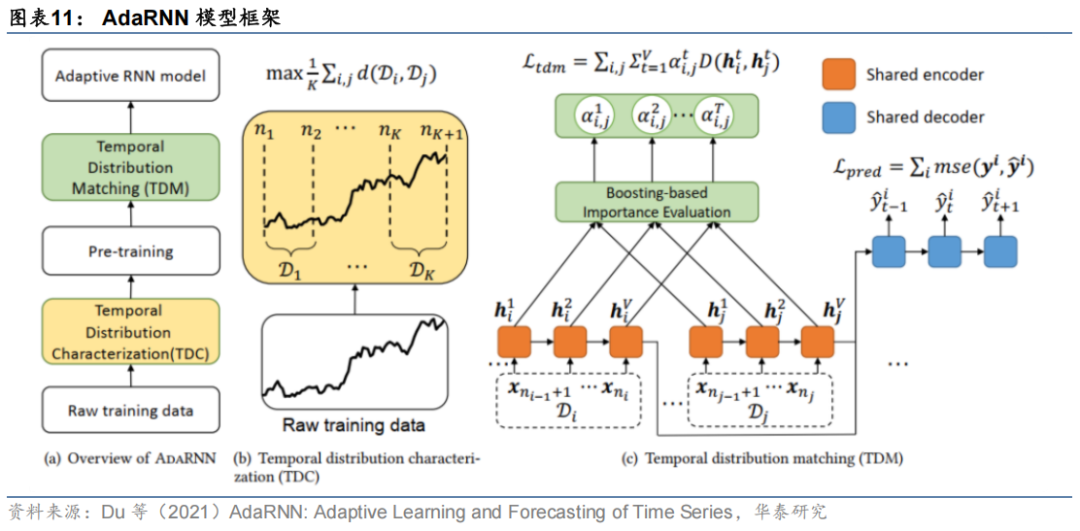第二种应对方法从模型结构出发,重点在于让模型能学习和预测数据分布的变化,从而适应非平稳的时间序列。其中,Du等(2021)提出了一种网络结构AdaRNN,将迁移学习和循环神经网络相结合。其核心思路分为两步,第一步通过时序相似性量化模块TDC(Temporal Distribution Characterization)将历史时间序列分成分布差异最大的多个小段;第二步通过时序分布匹配模块TDM(Temporal Distribution Matching)基于这些不同分布的序列,让模型学习共性信息,从而在预测有分布变化的数据时,能够更好地根据共性信息实现泛化。