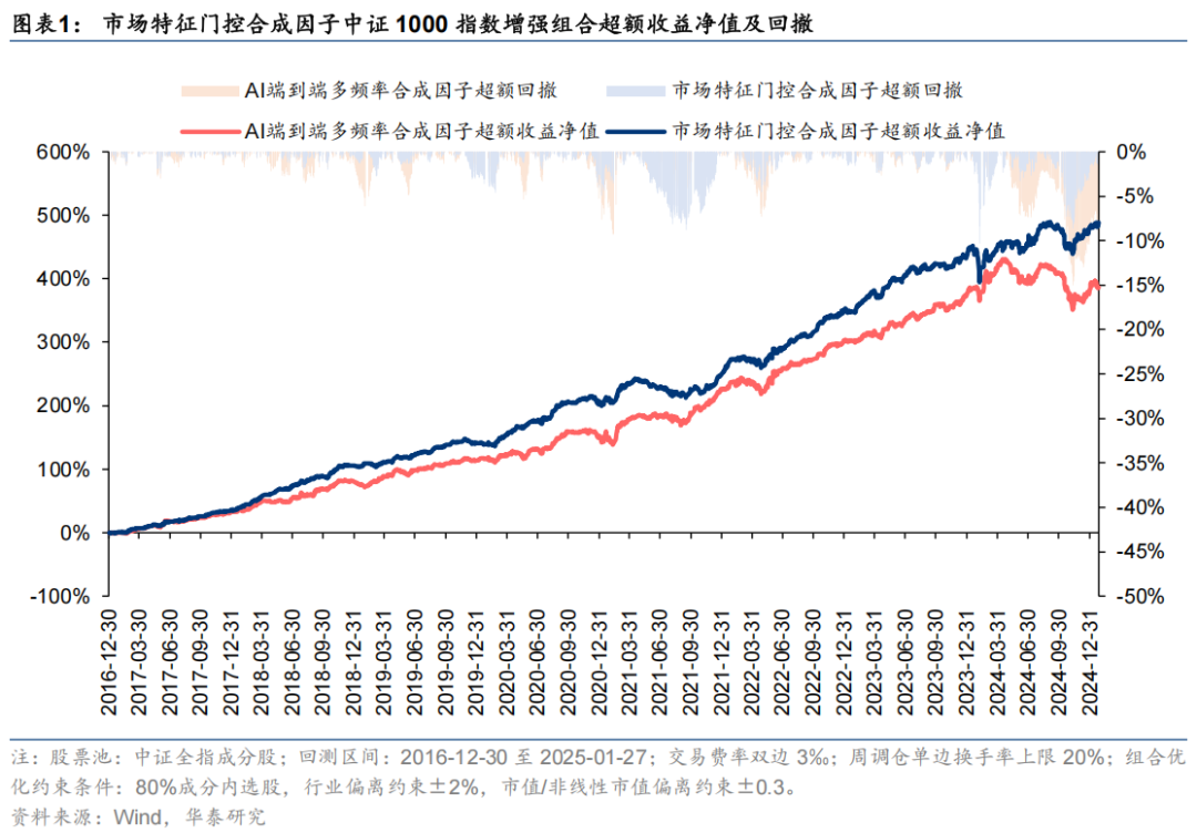 对比以上结果可知,在传统端到端AI量价等因子的基础上加入市场特征门控因子后表现得到了较为显著的提升。其中:1、对比三组合成因子表现可知,三组新特征集经基础GRU模型合成后因子表现一般,而加入市场特征门控以及三层注意力特征提取模块后合成因子表现提升显著;2、从因子评价指标的角度看,合成因子3的RankIC均值达到14.5%,在端到端AI量价合成因子的基础上提升了0.8 pct,RankICIR达到1.43,在端到端AI量价合成因子的基础上提升了0.27,改进效果显著;3、经组合优化后,中证1000指数增强组合自2016-12-30至2025-01-27年化超额收益25.6%,信息比率3.29,业绩表现优异。