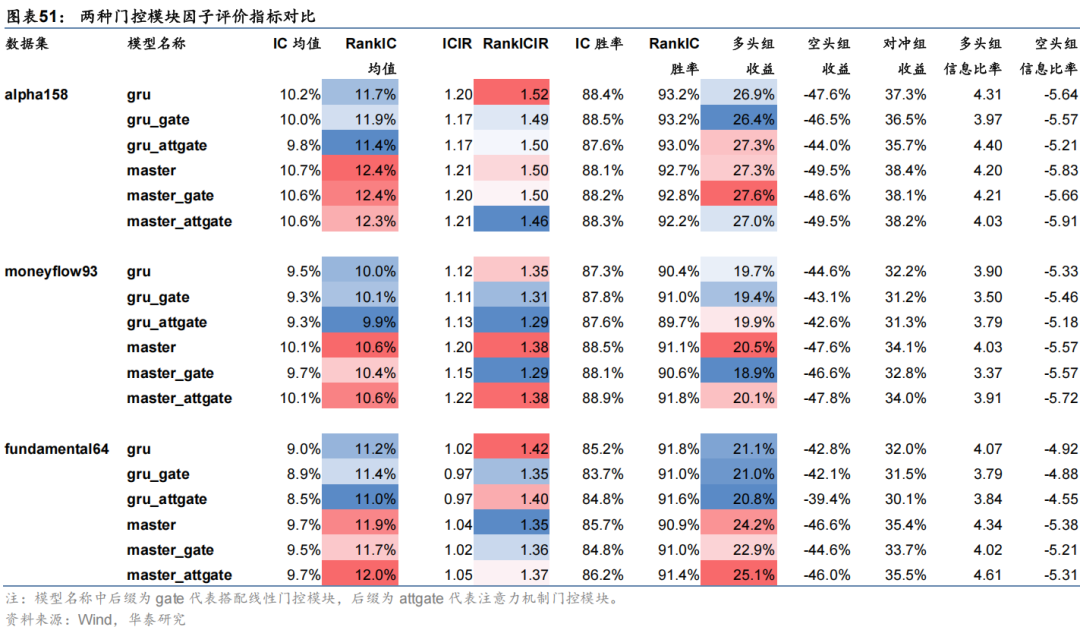 1、从因子评价指标看,线性门控模块和注意力门控模块孰优孰劣并无确定性结论。从RankIC看,对于GRU模型,线性门控模块在三组数据集上均表现最好,而对于Master模型,注意力门控模块综合表现较优。