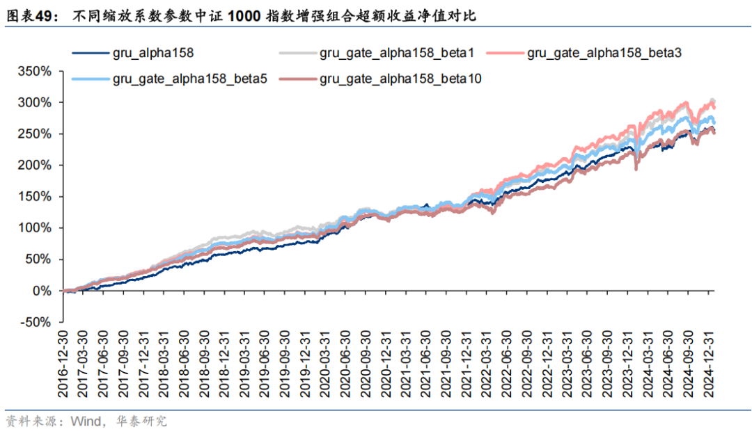 以上结果表明,Master模型中的三层注意力特征提取模块总体效果优于双层GRU:1、从预测因子评价指标看,三层注意力模型在三组数据集上RankIC均值相比GRU模型均可提升约0.7 pct,RankICIR略有降低;2、三层注意力模型在三组数据集上分层回测多头组收益均高于GRU模型,其中在数据集Fundamental64上多头收益提升效果较突出;3、从中证1000指数增强组合业绩看,三层注意力模型在三组数据集上年化超额收益及信息比率等指标均优于GRU模型,对于MoneyFlow93及Fundamental64数据集提升效果突出,全区间年化超额收益可提升约2 pct。本节重点对线性门控模块中缩放系数参数 β 的敏感性进行测试。市场特征对个股特征的调整方法用公式表示为: