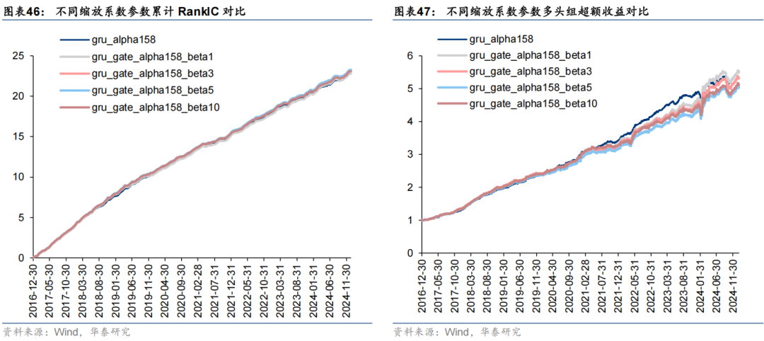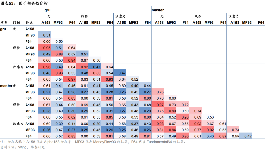 可以发现,不同数据集因子相关性较低,GRU模型与Master模型因子相关性同样也较低,普遍在0.6左右;同模型同数据集不同门控模块因子相关性较高,普遍高于0.9;另外本文测试因子与AI端到端因子相关性普遍较低,大多数不超过0.5。