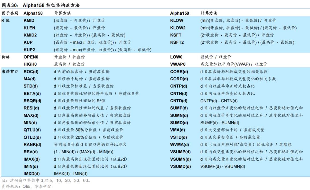 市场特征用于刻画市场当前状态,需选择具有代表性的指标。原论文中作者采用沪深300、中证500以及中证800三个指数的量价指标作为市场特征,然而原论文中的任务选股域仅局限于中证800成分股。因此本研究拟将宽基指数扩展至中证全指域,分别选取沪深300、中证500、中证1000和中证全指四只指数的各21个量价指标共构建84个刻画市场状态的特征。21个量价指标分5组,分别刻画宽基指数近期收益率及成交额的变化及波动,构造方法与原论文保持一致,具体构造细节如下。原论文中个股特征选用微软qlib框架中的预置特征集Alpha158,本研究中在此基础上额外测试两组特征集,分别为基本面+量价特征集Fundamental64以及资金流特征集MoneyFlow93。其中基本面+量价特征集从价值、成长、盈利、预期等多个维度计算64个基本面及量价指标,资金流特征集来自Wind底层表AShareMoneyFlow,包含不同类型投资者、不同交易时间段共93个资金流入流出数据。三组特征集的构造方式如下。