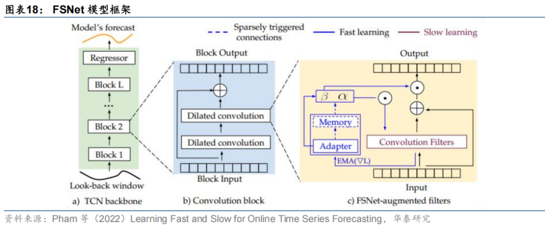 第三类应对方法着眼于改进模型训练模式,通过在线学习、元学习等方式让模型更及时准确的适应新数据分布。其中,Pham等(2022)提出FSNet(Fast and Slow learning Network),借鉴互补学习系统(Complementary learning systems theory,CLS)理论,FSNet设计了一个快-慢学习网络用于在线时序预测场景,对于神经网络中的每一层均设计一个快速适应单元和一个联想记忆单元,通过检测两者的梯度相似性动态更新模型参数。