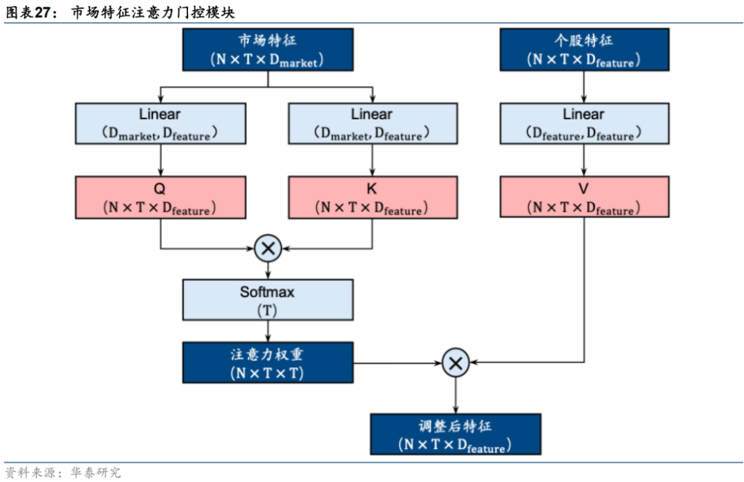 参考Master模型结构设计,本研究拟测试神经网络结构主要包含门控模块和特征提取模块。其中门控模块设计采用两种方案,方案一与原文献保持一致,使用单层线性层提取市场特征权重;方案二将线性层替换为注意力层,将市场特征作为查询向量和键向量,将个股特征作为值向量,利用市场特征输出的注意力权重调整个股特征的重要性,结构如下。