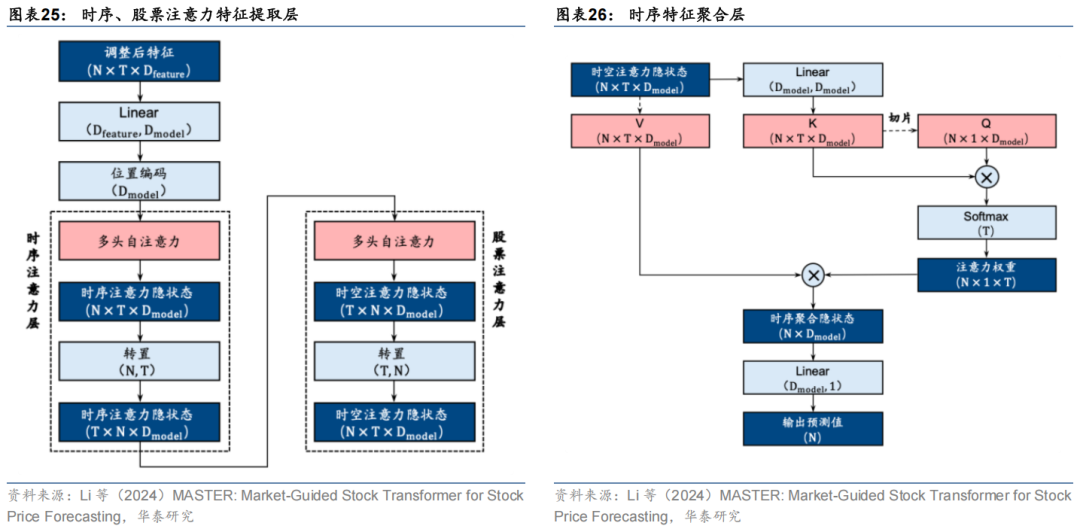 其中前两层采用标准的多头自注意力层,分别提取时序维度 以及股票维度 上的注意力特征,最终输出一个包含时空注意力特征的隐状态层。最后一层以该隐状态作为输入,将该隐状态的最后一个时间步作为查询向量,计算其与其他时间步之间的注意力权重,再与输入隐状态点积,将前两层提取的所有时间步信息聚合到最后一个时间步作为模型输出。