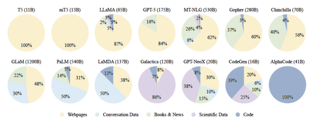 2.专业数据(Specialized Data)包括多语言数据Multilingual Text、科学数据Scientific Text、代码Code以及领域特有资料等数据。通过在预训练阶段引入专业数据可以有效提供 LLM 的任务解决能力。下图给出了一些典型 LLM 所使用数量类型的分布情况。可以看到不同的 LLM 在训练类型分布上的差距很大,截止目前,还没有得到广泛认可的数据类型分布比例。