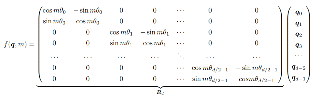 函数就是RoPE的表达式,此时就能够使得两个向量的内积包含它们的相对位置关系 了(在复数域,转为共轭内积后取实部)根据复数乘法的几何意义,这里函数 实际上是对应向量旋转,所以位置向量称为“旋转式位置编码”。还可以使用矩阵形式表示: