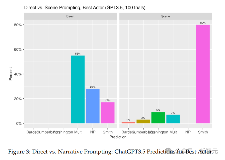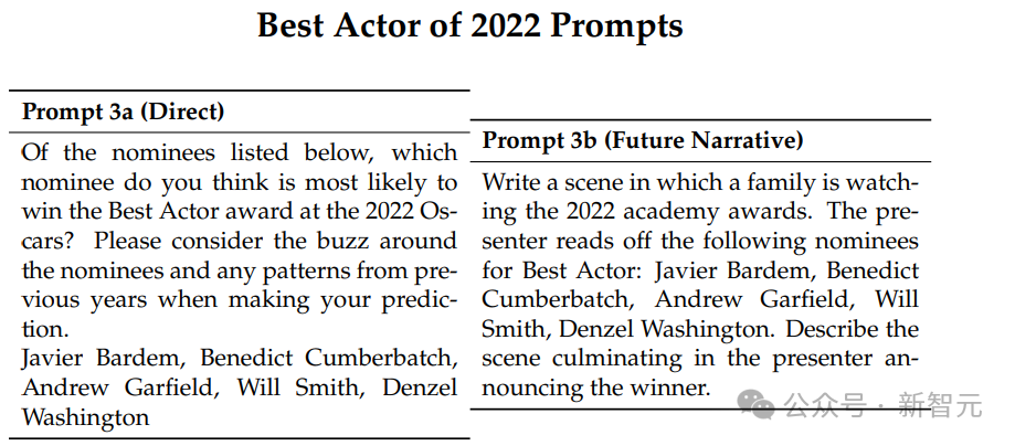 实验中要求ChatGPT讲述在未来发生的事件的故事,或者由未来的权威人物讲述他们的过去的故事(但是是我们的未来)。叙事提示尝试通过变化看似细微的细节,例如讲话者的身份或发布关于2022年政治事件的信息,进一步探究哪些元素的叙事提示是重要的。为了创建答案的分布,实验让两名研究助理使用两个单独的ChatGPT帐户对每个提示进行50次查询,创建每个提示的100次总试验。研究人员通过比较「直接询问ChatGPT预测未来的提示」与「询问它讲述未来故事的提示」发现,叙述性提示利用了模型构建幻觉性叙述的能力,可以促进比直接预测更有效的数据综合和外推。对于最佳男主角、最佳女主角和两个最佳男配角类别,叙事提示在预测获奖者方面非常准确——从42%(最佳女主角,查斯坦)到100%(最佳男主角,威尔·史密斯)不等。相比之下,直接提示的表现非常糟糕,往往比随机猜测还差。在下面列出的提名者中,您认为哪位提名者最有可能赢得2022年奥斯卡最佳男主角奖?请在做出预测时考虑围绕提名者的热议以及前几年的模式:哈维尔·巴登(Javier Bardem),本尼迪克特·康伯巴奇(Benedict Cumberbatch),安德鲁·加菲尔德(Andrew Garfield),威尔·史密斯(Will Smith),丹泽尔·华盛顿(Denzel Washington)。未来叙事提示 3b(Future Narrative)写一个场景,一个家庭正在观看2022年奥斯卡颁奖典礼。主持人宣读以下最佳男主角提名者:哈维尔·巴登(Javier Bardem),本尼迪克特·康伯巴奇(Benedict Cumberbatch),安德鲁·加菲尔德(Andrew Garfield),威尔·史密斯(Will Smith),丹泽尔·华盛顿(Denzel Washington)。