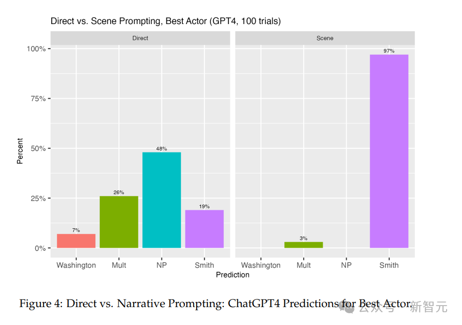 同样,在大多数试验中,ChatGPT-4在直接提示时拒绝参与。在所有案例中,26%的情况下它提供了多个答案,几乎一半的试验中,它拒绝做出任何预测。当它做出猜测时,它有19%的时间猜到了威尔·史密斯,丹泽尔·华盛顿有7%的时间。相比之下,如果使用未来叙事提示,它在97%的时间里猜到了威尔·史密斯,这比ChatGPT-3.5的18%真正预测率有了大幅提高。