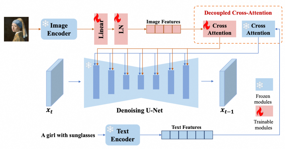 IP-Adapter方法是一种对预训练文生图模型的改进,在预训练文生图模型的基础上,对于Unet中的交叉注意力模块,针对图像特征,会添加一个额外的交叉注意力层,这样模型能够同时接受文本和图片作为prompt。同时IP-Adapter对文本和图像的交叉注意力进行了解耦,可以使图像与文本很好地结合,不互相干扰。