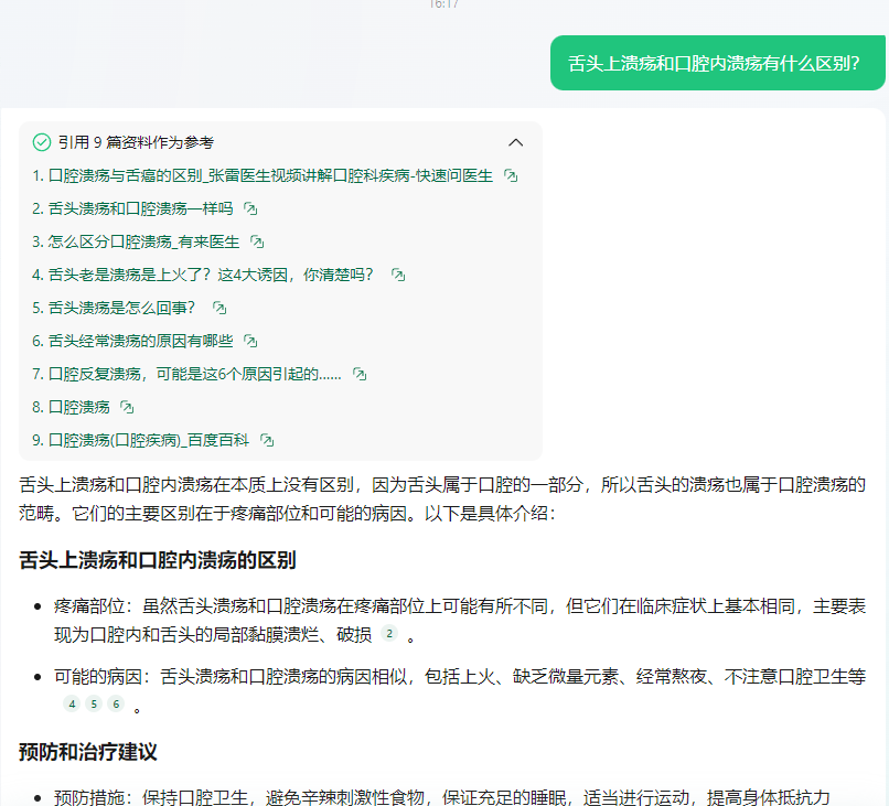 或者说为什么根据这些作为参考呢?为什么又是13篇呢?其他就不一一截图了,说结论,我并没有看出有什么规律。有的是认证的医师,有的是自媒体文章,而且点赞评论的也不多,有的公众号内容,还有两条百度百科。于是,我有去搜了一下,百度的口腔溃疡关键词,剔除广告和非信息内容,发现这个内容来源也对不上。所以我有理由推测,他是综合的算法,百度百科抓1-2条,医生的解释抓1-2条或更多,公众号再抓几条,其他媒体再抓几条。