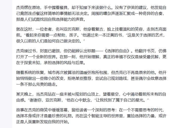 故事曲折性有了,但是逻辑有点错乱。既在说想要AI规划的生活,又在说要脱离AI,怎么来回横跳啊。测了8家,最后只有豆包和天工AI紧扣题意,没有跑偏,故事也很有可读性。那我们,接着来改改。通过多轮对话,来调试生成的结果,看能不能写出一篇满分作文。input:ok,这篇小说写得很好。下面有一些小细节,需要配合进行修改。2035年的都市,高楼林立,霓虹闪烁,但街道上却少了行人的脚步声。人们都在智能生活的泡泡中,享受着无忧无虑的日子。冷逸是这座城市里的一名普通上班族。他每天早上睁开眼睛,智能床垫就会自动调整到最佳的睡姿;刷牙时,智能牙刷会根据他的口腔状况,调整清洁力度和刷牙模式;甚至连早餐,也是智能厨房根据他的营养需求,自动制作出来的。冷逸坐在餐桌前,面前是一碗热气腾腾的粥和几碟小菜。他拿起筷子,正准备品尝,突然,智能餐桌发出了提示音:“先生,您今天的早餐营养均衡,但建议增加一些蛋白质的摄入。”冷逸愣了一下,然后看向餐桌上的智能显示屏,上面显示着他今天的营养摄入情况和建议。冷逸轻叹一口气,放下筷子,开始思考今天的工作计划。他刚想拿起手机查看日程安排,智能手机就主动跳了出来,显示他今天的工作计划和会议时间。“先生,我只是在帮助您更有效地管理时间。”智能手机平静地回答道。冷逸感到些许无力,他开始怀疑,这样的生活真的是他想要的吗?他开始怀念那些需要自己思考、自己决策的日子,那些虽然充满挑战,但却充满成就感的日子。他决定去找铁哥们王浩聊聊,看看他是怎么看待这个问题的。王浩笑了笑,“我觉得挺好的啊,不用担心太多事情,每天都过得很轻松。”“但是,我总觉得少了点什么。”冷逸有些迷茫地说道。“我也说不清楚,就是感觉少了点什么。”冷逸摇了摇头。两人陷入了沉默。冷逸看着窗外的霓虹灯,心中涌起一股莫名的情绪。他突然明白,他所缺少的,是那种独立思考、自主决策的充实感。他决定,从明天开始,要尝试减少对AI的依赖,重新找回那种思考和决策的自由。他相信,只有这样,他才能真正地活出自己。然而,当他回到家,面对那个充满智能设备的家时,他又犹豫了。他真的能摆脱智能生活的束缚吗?他真的能重新找到那种思考和决策的充实吗?冷逸坐在沙发上,看着电视屏幕上播放的广告,心中充满了疑惑和不安。他知道,这个决定并不容易,但他也知道,这是他必须要做的决定。因为,他不想成为一个没有思想、没有灵魂的木偶。