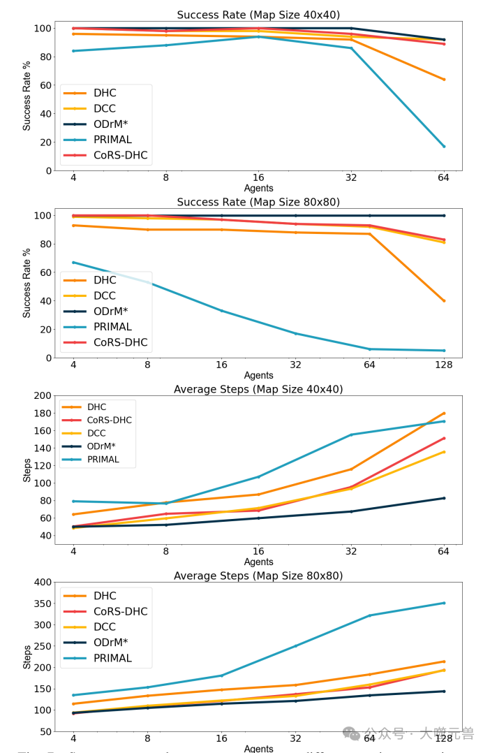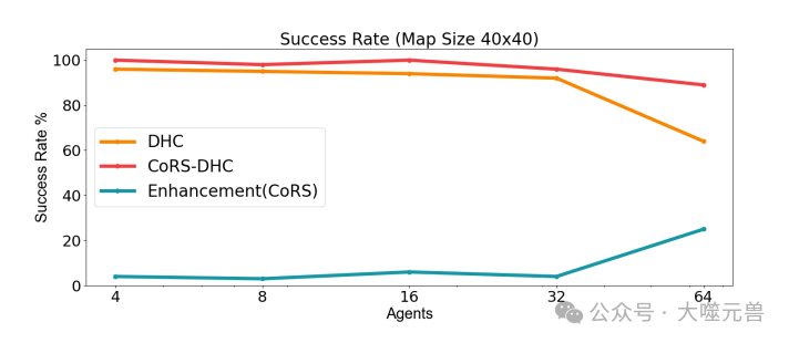 实验结果表明,CoRS-DHC在所有测试集中显著优于现有的DHC算法,尤其是在高密度智能体场景中,路径规划成功率提高了20%以上。此外,CoRS方法有效减少了所有智能体到达目标点所需的步数。